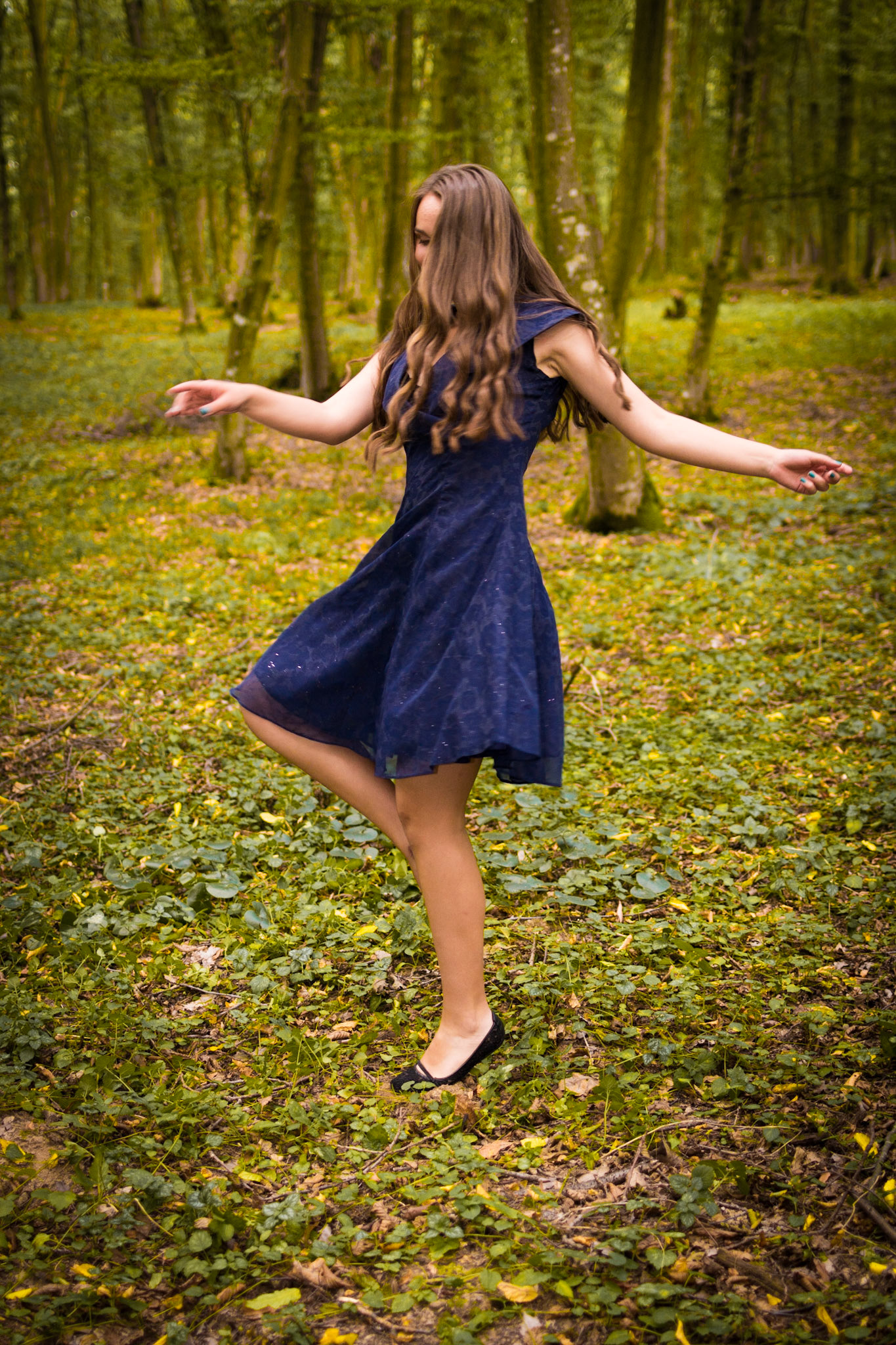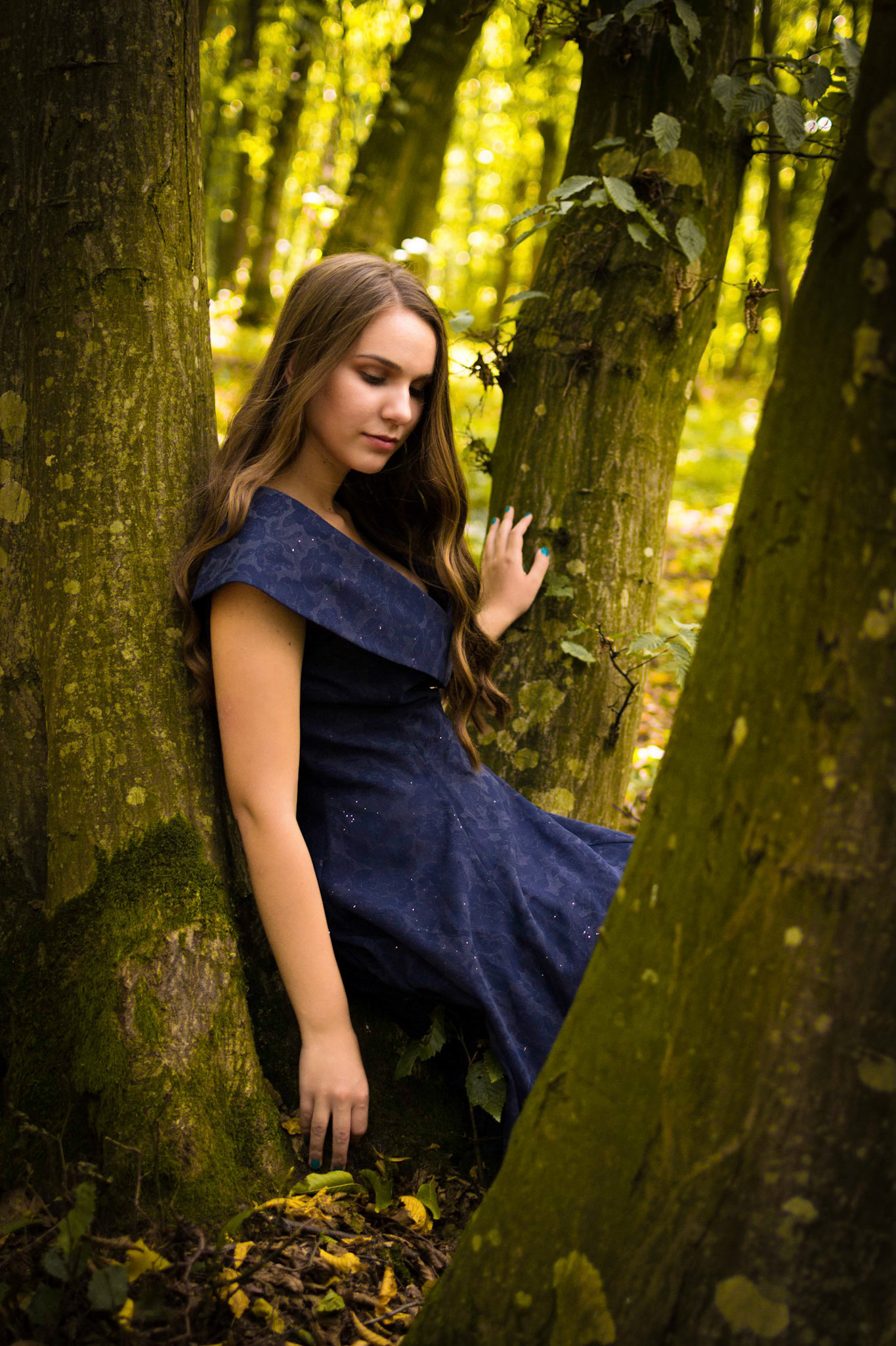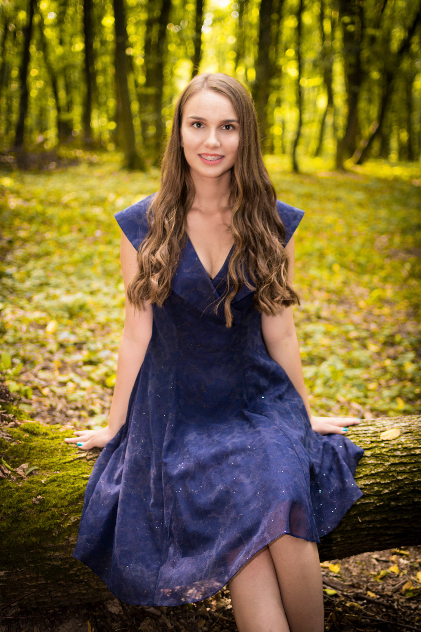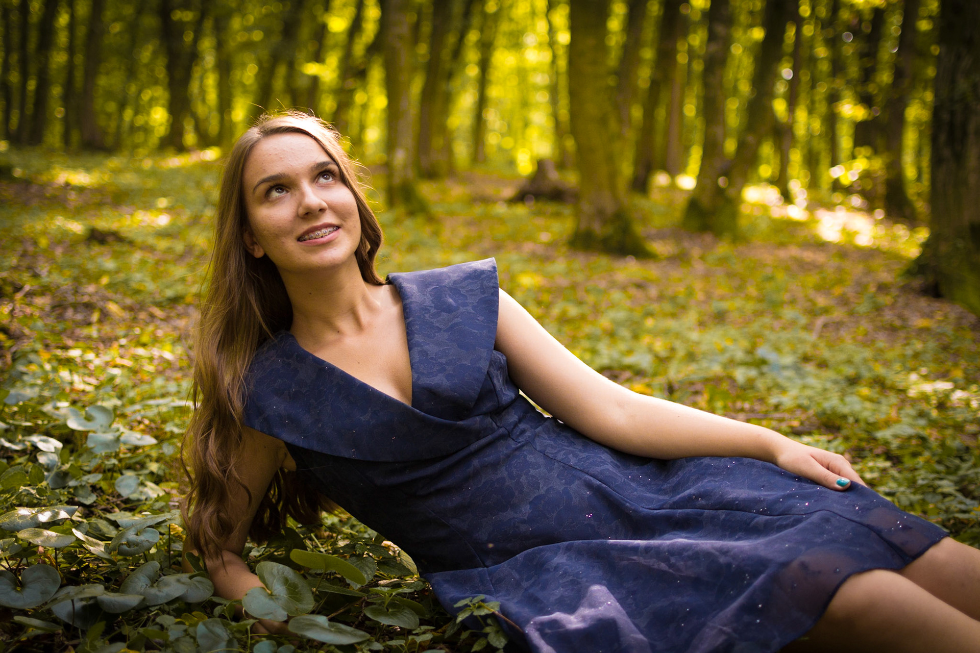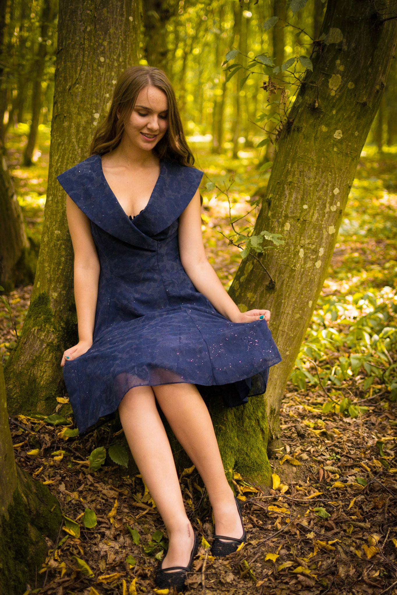 Set deep in the forest, Andreea adds a splash of royal blue to the Autumn colours of the fallen leaves.